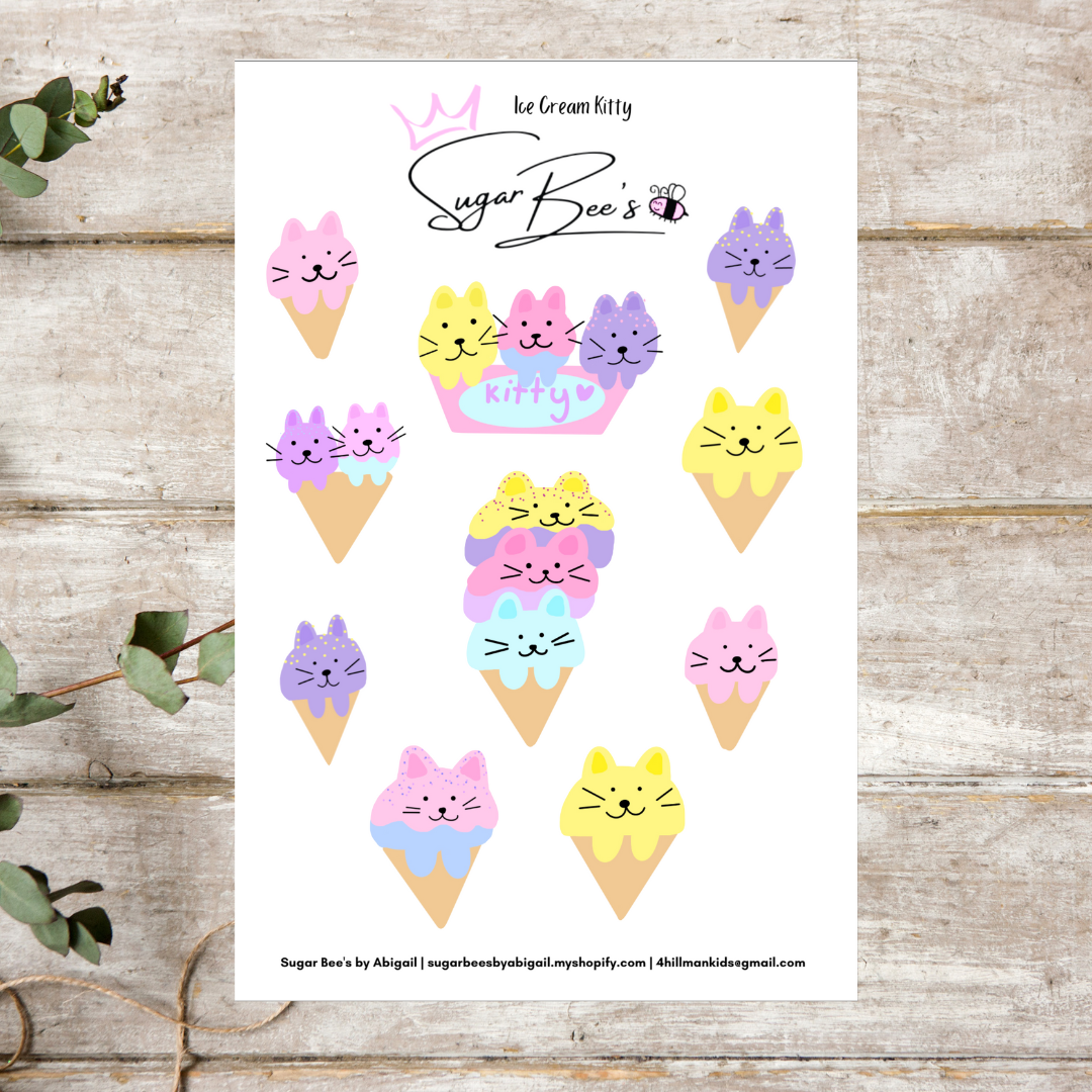 Add a scoop of sweetness to your style with the Ice Cream Kitty Sticker Sheet! This purr-fect sticker sheet features cute kitties on tasty cones, ready to add a delicious touch of cuteness to any project. Meow-velous!